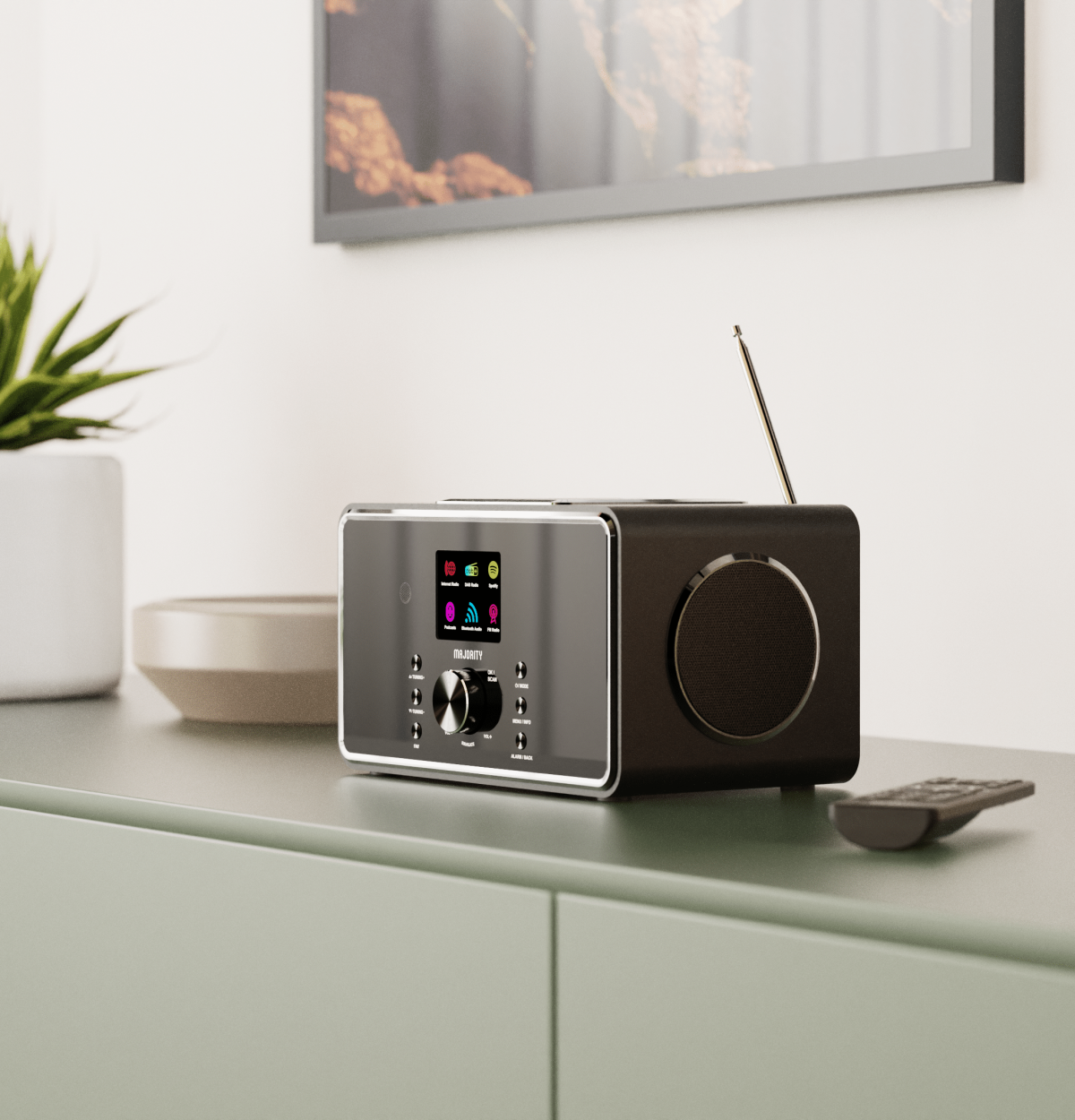 The Majority Bard is a compact 2.1 music system with 100W output, DAB+/FM, internet radio, Bluetooth, Spotify Connect, USB playback, and a built-in subwoofer. It delivers powerful sound with a sleek design and user-friendly controls.