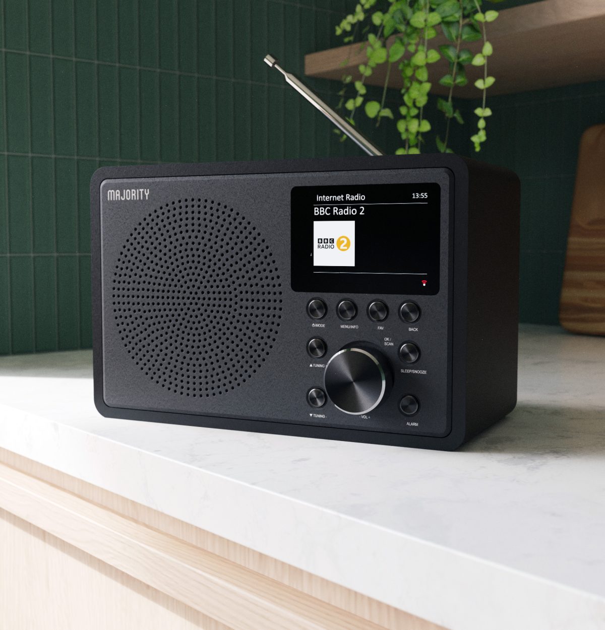 The Majority Touro is a compact Bluetooth internet, DAB+ (EU & UK only), and FM radio featuring Spotify Connect, dual alarms, and a colour LCD display. It offers 40 station presets, USB playback, and app control via the OKTIV app.